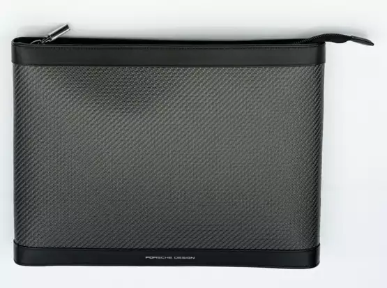 A dark grey carbon and black leather laptop case by Porsche Design. New condition. Original dust bag. Manufacturer's mark.