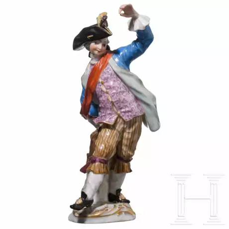 Porzellan, farbig bemalt, gold staffiert. Sich auf einen Baumstumpf stützender, tanzender Kavalier mit Hut und roter Schärpe. Unterseitig mit Knaufmarke, (1. Wahl), Modellmarke "2324" sowie Pressmarke "6". Höhe 14,6 cm.