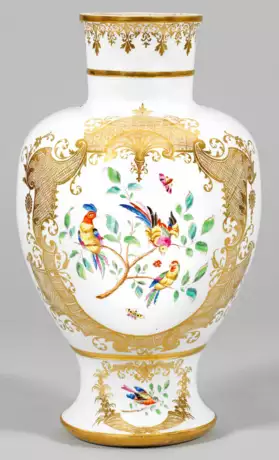 Über ausgestelltem Stand ovoider Korpus mit gerundeter Schulter, eingezogenem Hals und leicht ausschwingendem Profilrand. Fuß und Hals durch goldstaffierte Profilbänder gegliedert. Beidseitig der Wandung großflächig angelegte Goldreserven aus Blattrocaillen und Gitterwerk, darin farbenprächtige Darstellung von auf einem Ast sitzenden Papageien sowie weiteren exotischen Vögeln, umgeben von Schmetterlingen. Polychrome Malerei (später). Der Rand mit breiter, umlaufender Goldspitzenbordüre. Dreher- und Formerzeichen aus zwei Kreuzen (ähnlich dem von Johann Christoph Schumann). Produktionsbed. Brandfleck. Schwertermarke. H. 43 cm.