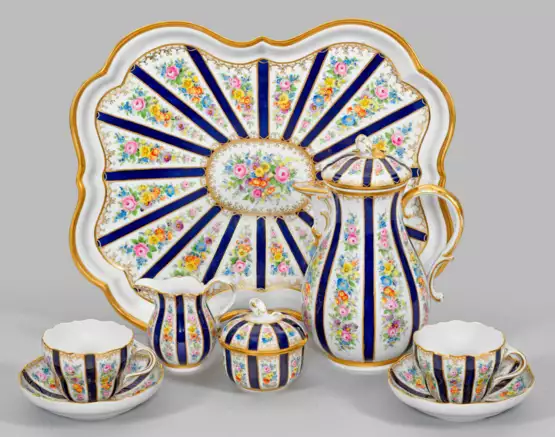 6-tlg.; Kaffeekanne, Sahnegießer, Zuckerdose, 2 Kaffeetassen mit Untertassen und großes Tablett. Von blauen Bändern gesäumte, farbenprächtige Blumengebinde in feiner polychromer Malerei mit Goldstaffage. Partiell ber.; Gold minim. erg.; Schwertermarke. Kannen-H. 25 cm. Tablett 40 cm x 33 cm.
