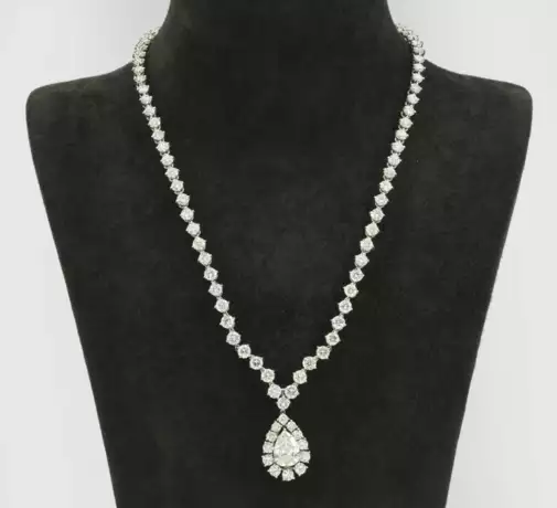 Necklace set with a diamond approx. 2,50 ct. (I-J/vs) and diamonds approx. 13,70 ct. (H-J/vvs-vs), in 18 k white gold.