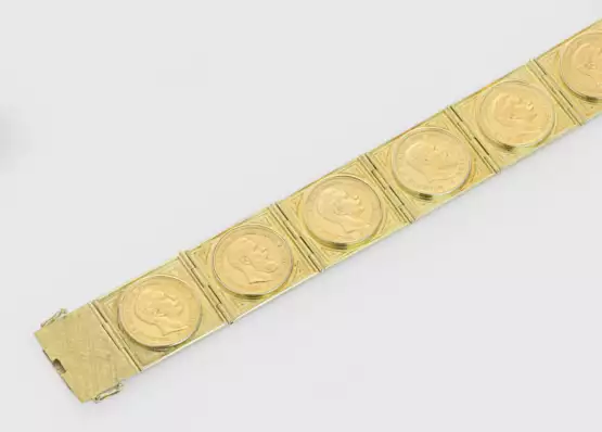 Gelbgold/Dukatengold gest. 585, 900er. Linear besetzt mit 20 Mark-Goldmünzen Deutsches Reich von 1910 und 1912 "Wilhelm II Deutscher Kaiser König von Preussen" und 1 Münze "Freie und Hansestadt Hamburg", in profilierter, fein satinierter Fassung, unterteilt durch kreisförmig durchbrochene Glieder. Sehr feine Goldschmiedeausführung. Gew. ca. 115,93 g.