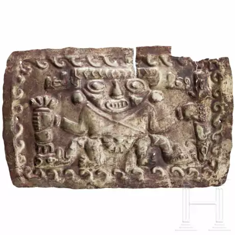 Tumbaga (Gold- und Kupferlegierung, Goldblech). Rechteckige Gewandapplike mit der Darstellung einer frontal stehenden Gottheit mit breitem Kopfputz. Rand mit Befestigungslöchern. Obere linke Ecke beschädigt. Risse. Maße: 7 x 11,5 cm, Gewicht: 11,22 g - Die Altersbestimmung erfolgt aufgrund der Charakteristika des Objekts, ohne ein TL Gutachten angefertigt zu haben.