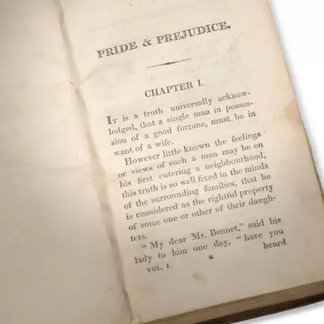Pride and Prejudice was written between October 1796 and August 1797 when Austen was not yet twenty-one, the same age, in fact, as her fictional heroine Elizabeth Bennet. Again centering her story on social class and marriage, Austen sharply observes her characters against the backdrop of Georgian England. After an early rejection by the publisher Cadell, Austen's novel was finally bought by Egerton in 1812 and published in late January 1813 in a small edition of approximately 1500 copies. This is the earliest-known specifically dateable copy of the novel, which was published on 28 January 1813. Gilson A3.