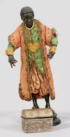 Junger Prinz in höfischer Tracht des 18. Jh., eine mit Modeschmuck gefüllte Schatztruhe mit orientalischen Reliefdekor (ergänzt) präsentierend. Terrakotta farbig gefasst, Glasaugen, Seidenstoffe mit Brokatstickerei, Metall, Schmucksteine und -perlen. Runder, ebonisierter Holzsockel, neuzeitlich. Ges.-H. 22 cm. Minim. Alters- und Gebrauchsspuren.