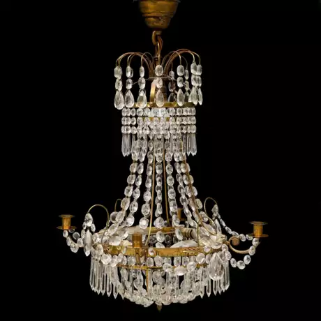 Лот 1026 | Prismenleuchter, um 1920/30, 5-flammig, Messing-Gestell mit reichem Kristallbehang, an Messing-Reifen 4 gebogene Kerzenleuchterarme, H. ca. 76 cm, Dm. 60 cm