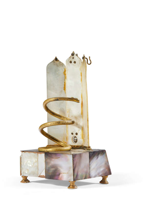 nacre et nacre grise peintes, bronze doré et velours, trois pelotes à aiguilles : une à tiroir surmontée d'une vue de la cathédrale de Vienne, une autre formant navire représentant sur la voile une vue de la colline de Galitzinberg de Vienne d'après Balthasar Wigand, titrée 'Wien Galitinberg', une formant encrier tenue par un personnage sinisant, et un thermomètre à tiroir et à décor de bouquets ; accidents et manques