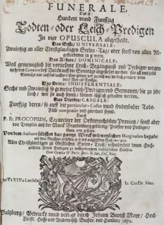 VD17 1:040404X. Dünnhaupt 25. Erste u. einzige Ausgabe. - Seltene Sammlung von Leichenpredigten des sprachgewaltigen Kapuzinermönchs, der oft mit Abraham a Santa Clara verglichen wird. - Titel mit hs. Besitzvermerk u. kl. Läsur, etw. gebräunt u. braunfleckig, Ebd. etw.. fleckig u. berieben, oberes Kapital eingerissen.