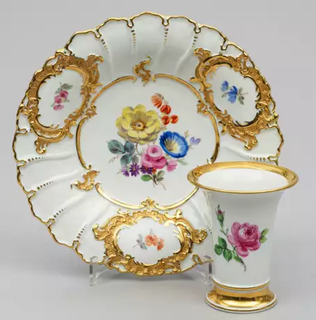 Runde, gemuldete Form. Rocaillereserven in Glanz- und Mattgold (sog. Goldbronze) im Relief. Darin und im Spiegel Blumengebinde sowie einzelne Blüten. Trompetenform mit Rosendekor. Polychrome Malerei mit reicher Goldstaffage. Modell-Nr. F 152 a (Teller) bzw. Q 22 /8. Vasen-Form-Entw. Johann Daniel Schöne. Teilw. minim. rest.; Schwertermarke. Teller-D. 29,5 cm. Vasen-H. 14 cm.