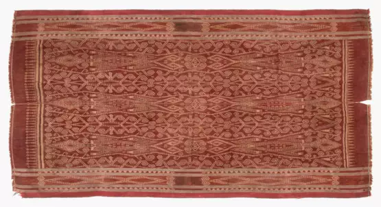 Borneo, 1.Hälfte 20.Jh. Baumwolle in diversen Rottönen. Ikat-Webtechnik. Zeremonialtuch aus zwei Bahnen, mit figürlichen Mustern. 166x85 cm.