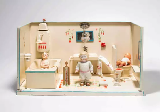 Deutscher Hersteller, um 1930. Blech, crèmeweiss lackiert. Rechteckig. Badewanne mit Duschbrause, Lampe über Lavabo und Toilette. Mit diversem Zubehör. Mit 2 Biscuit- und 1 Massepüppchen (H 7–8,5 cm). 30,5x15,5x16,5 cm.