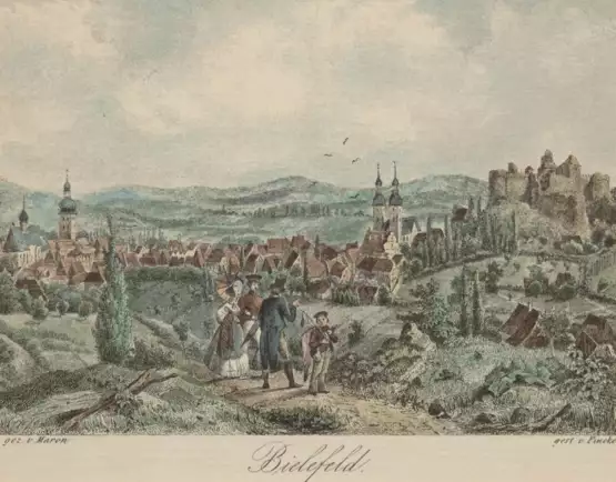 Лот 249 | "Bielefeld", kolorierter Stich, von Fincke, gez. v. Maren, 13x17 cm, im Passepartout hinter Glas und Rahmen
