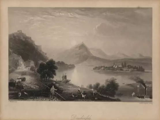"Burgruine Drachenfels, Ansicht von Rolandseck", Stahlstich v. A.H. Payne nach Witthöft, Blatt an den Rändern gebräunt und min. fleckig, 14x18 cm, im Passepartout hinter Glas und Rahmen