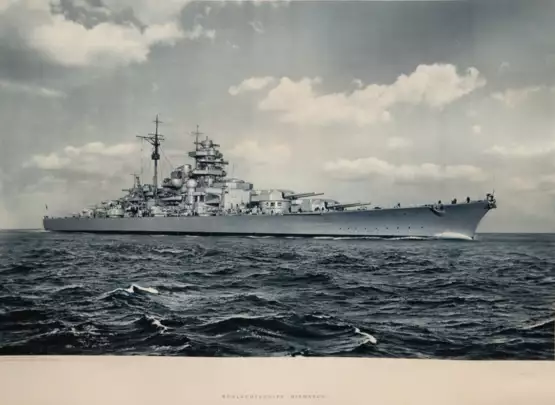 Лот 297 | "Schlachtschiff Bismarck", Aufnahme Blohm & Voß, Hamburg, Kupfertiefdruck Gustav Petermann Druckerei Hamburg, 37,5x57 cm, hinter Glas und Rahmen