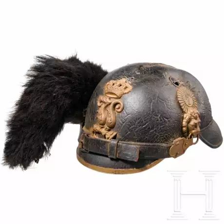 Schwarzer Lederkorpus (eingefallen, craqueliert, Futter fehlt) mit in Resten vergoldeten Messingbeschlägen, Bärenfellraupe (lose beiliegend, sichtliche Fehlstellen), vergoldetes zweiteiliges L-Emblem. Offiziersmäßiger Sturmriemen mit gekörnten Endgliedern an vergoldeten plastischen Löwenköpfen, Offizierskokarde mit Chiffre "L". Sichtliche Lager- und Altersspuren.