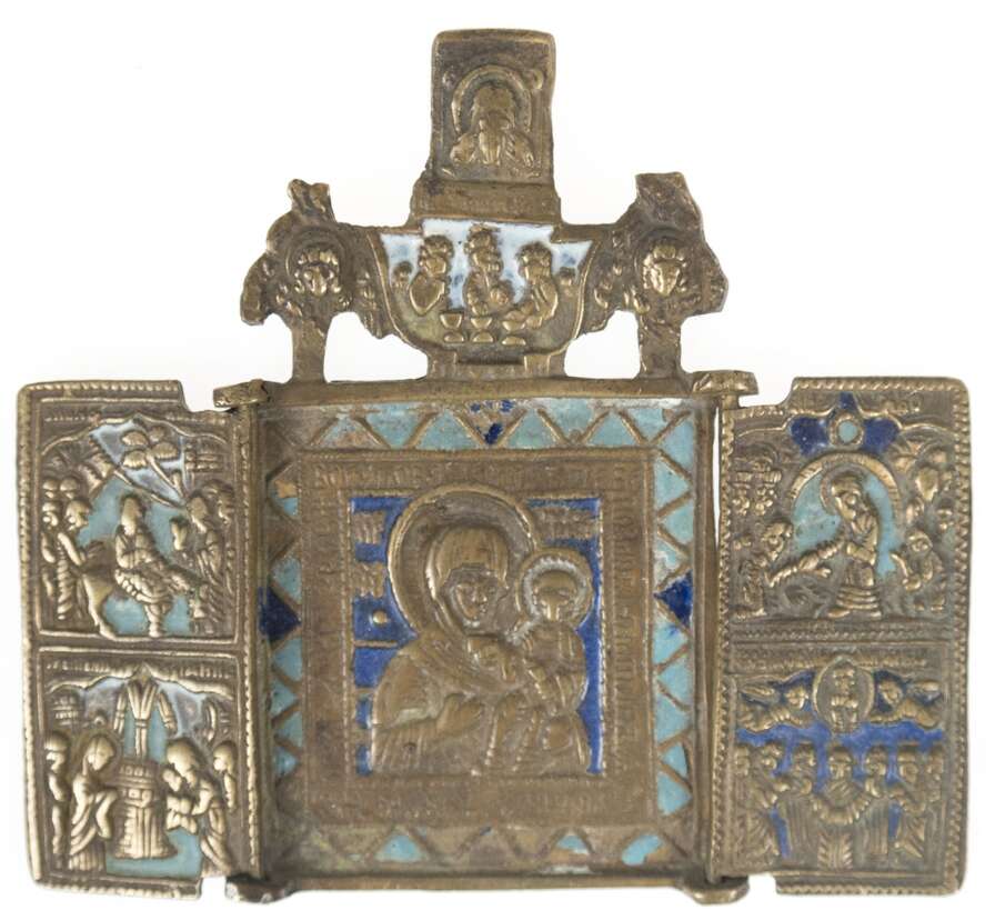 Лот 603 | Reise-Ikone, Tryptichon, Russland 19. Jh., reliefierte Heiligendarstellungen, z.T. farbig emailliert, 9x10 cm
