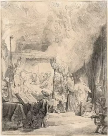 B. 99, White/Boon (Hollstein) 99 III, Nowell-Usticke 99 IV (von V), Hinterding/Rutgers (New Hollstein) 173 IV (von V). Wz. Lilie. Vor den finalen Arbeiten. Ausgezeichneter, harmonischer Druck mit schmalem Rändchen um die Plattenkante bzw. um die Einfassungslinie. Etwas fleckig und leicht vergilbt, unmerkliche Läsur mittig nahe der betenden Figur, oben rechts geschlossener vertikaler Randeinriss in den Wolken, weitere Randläsuren, vereinzelte Knitter- und Gebrauchsspuren, sonst jedoch in guter Erhaltung.
