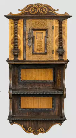 Kiefern-, Eichen- und Ulmenholz, massiv und furniert sowie teilw. dunkel gebeizt. Flaches Wandschild mit passig geschweiften Seitenwangen als Träger für Ablageflächen. Oberhalb rechteckiger, eintüriger Korpus, flankiert von eingestellten Halbsäulen mit passig geschweiftem oberen Abschluss. Bez. K.H.3. Rücks. Inventaretikett "Schloss Salem Raum No.57 O.-Nr. 30" und Etikett "C. Held Vergolder & Antiquar Baden Baden. Hoflieferant J.G.H. Herzogin v. Hamilton, Prinzessin von Baden" sowie Auktionsetikett "Baden". Erg.; H. 112 cm. 55 cm x 37 cm.