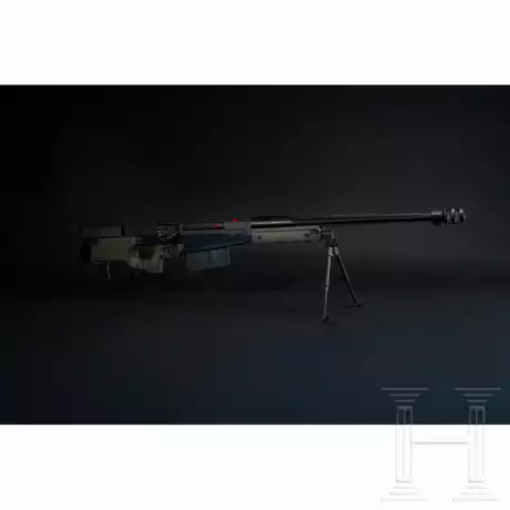 Cal. .50BMG, SN. AW5013247, heavy, fluted barrel with dual-chamber muzzle brake, bright-bore, length 74 cm. Valid proof marks. Aluminium receiver. Bolt action with six locking lugs. Five-shot magazine. Ambidextrous safety lever. Crisp single-stage trigger. Two-piece, green plastic stock with folding buttstock. Stock with vertically adjustable cheek piece and extendable butt plate and ground spike. Bipod. Mounted on the Picatinny rail is a Schmidt & Bender PM II scope 5-25 x 56 with tactical reticle. Carrying case and manual for the scope included. Length 135 cm.