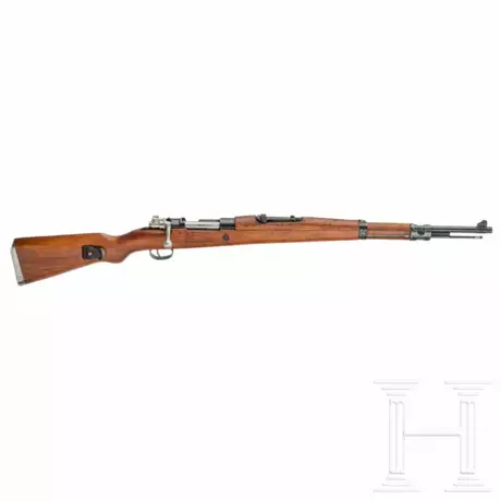 Kal. 8x57JS, Nr. M89955, nummerngleich. Fast blanker Lauf. Fünfschüssig. Dt. Beschuss 1998. Hülsenkopf mit jugoslawischem Wappen, links gemarkt "Preduzece 44". Originale Brünierung . Nrngl. Schichtholzschaft mit hoher Schaftkappe. Komplett mit Putzstock und Mündungsschoner. Lederner Schulterriemen. Länge 110 cm.