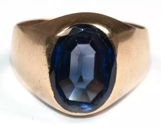 Лот 836 | Ring, 583er GG, besetzt mit ovalem Blautopas, nach innen facettiert, Warschau um 1940, Ges.-Gew. 7,91 g, RG 60