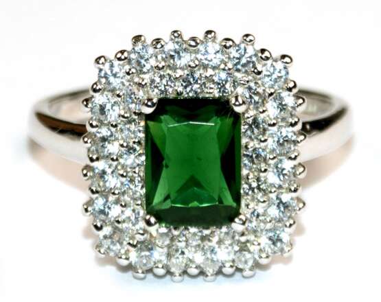 Лот 880 | Ring, 925er Silber, rhodiniert, smaragdfarbener Zirkonia ca. 8 x 6 mm, 2- reihige Entourage aus brillant funkelnden, weißen Zirkonia, Ringkopf ca. 15 x 14 mm, RG 57, Innendurchmesser 18,1 mm