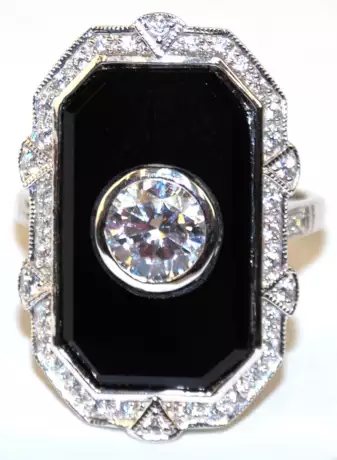 Лот 852 | Ring im Art-Deco Stil, 925er Silber, rhodiniert, großer Onyx, Entourage aus Zirkonia im Brillantschliff, Mittelstein ca. 1,5 ct., RG 57, Innendurchmesser 18,1 mm, Ringkopf ca. 2,8 x 1,7 cm, Millegriffe-Fassung mit aufwen…