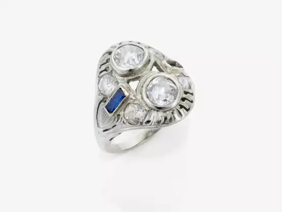 Platinum, assayed. 2 old-European-cut diamonds totalling approx. 1.4 ct., 4 smaller old-European-cut diamonds totalling approx. 1 ct., medium to good colour and clarity. 1 baguette-cut sapphire of approx. 4.5 x 1.3 x 1.5 mm. 1 sapphire is missing. The ring shows clear signs of wear and tear consistent with its age. Ringsize: 48.5. Ca. 5.3 g.