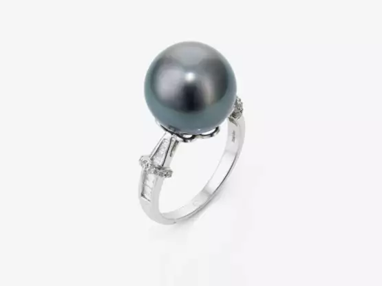 White gold 750/-, hallmarked. 32 baguette- and brilliant-cut diamonds totalling 0.24 ct. (inscribed in the ring rail). 1 round Tahitian cultured pearl, diameter approx. 12.6 mm. Ringsize: 54. Ca. 5.6 g.