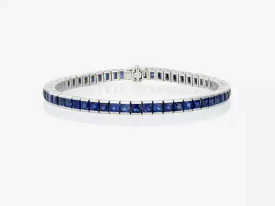 White gold 750/-, hallmarked. Approx. 57 carré-cut sapphires totalling approximately 9 ct. The bracelet is in very good condition, showing only minor signs of wear and tear consistent with its age. Length approx. 18.5 cm. Ca. 23.8 g.
