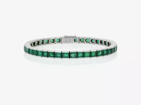 White gold 750/-, hallmarked. Jeweller's mark. Approx. 42 carré-cut emeralds of approx. 8 ct. A few of the emeralds are rubbed. Length approx. 17.5 cm. Ca. 23.6 g.