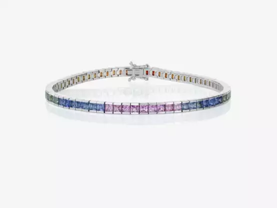 White gold 750/-, assayed. Approx. 72 sapphires in various colours totalling approximately 7 ct. The bracelet is in very good condition, showing only minor signs of wear and tear. Length approx. 19 cm. Ca. 15.8 g.