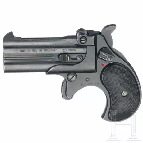 Cal. .38Special, SN. 104337, blankes Kipplaufbündel, Länge 75 mm. Beschuss 1970. Flügelsicherung. Links am oberen Lauf Modell und Kaliber, auf der Oberseite Firmierung. Fertigung in Aluguss, Läufe eingesetzt. Vollständig schwarz eloxiert. Schwarze Kunststoffgriffschalen mit feinster Fischhaut. Gute Erhaltung. Zusammen mit Futteral.