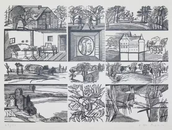 Hack/Schwarz 1.56-60, 62, 64 und 66. Spindler 44, 33. - Folge von 8 sign. und num. Holzstichen auf Zerkall-Bütten, jeweils in Textblätter eingelegt. Die Auflagenvermerke der einzelnen Graphiken liegen zwischen 66 und 180 Exemplaren. - ╔Dabei: Apuleius,L.╗ Amor und Psyche. Ein Märchen aus der Antike in der Übertragung von R.Jachmann u. G.de Beauclair. Ascona und Hamburg 1999. Fol. 73 S., 2 Bl. Mit 25 ganzs. Rad. v. F.Hoffmann. Orig.-Ppbd. mit mont. Deckel- und Rückenschild (R. Meuter). - 12. Druck der Ascona Presse von Roland Meuter. - Eines von 70 numerierten Exemplaren der Normalausgabe aus einer Gesamtauflage von 120. Druck auf Hahnemühle-Bütten bei der Firma Wolfau-Druck, Rudolf Mühlemann, Weinfelden (Text) und bei Willi Jessen, Berlin-Schöneberg (Handdruck der Radierungen). Den Satz der 15 Punkt und der 12 Punkt Stempel Schneidler besorgte Erich Gülland, Dielsdorf. Hoffmanns 25 Radierungen zu "Amor und Psyche" sind hier erstmals vollständig gedruckt; der "Ars Librorum"-Druck von 1963 enthielt nur eine Auswahl von sechs Radierungen.