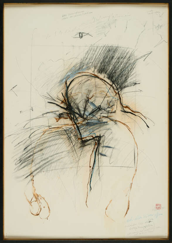 Minimally wavy. Traces of staples on the edges (due to the manufacturing process?). Traces of the creation process. Verso mounted. Otherwise good condition. The work was not removed from its frame for the catalogue description.