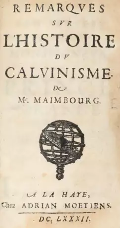 Selten. - Kritik des Werks von Louis Maimbourg, "L'Histoire du Calvinisme" (1682) von Jean Rou (1638-1711), Anwalt im Parlament, der nach Holland floh, wo er als Dolmetscher bei den Generalstaaten tätig war und die Widmung an den Prinzen von Oranien verfasste. Es handelt sich nicht um ein Buch von Pierre Bayle, wie der Titel vermuten lässt, von diesem stammt "Kritik der Geschichte des Calvinismus von Pere Maimbourg" (1683). - Etw. gebräunt, hs. Eintr. a.V.