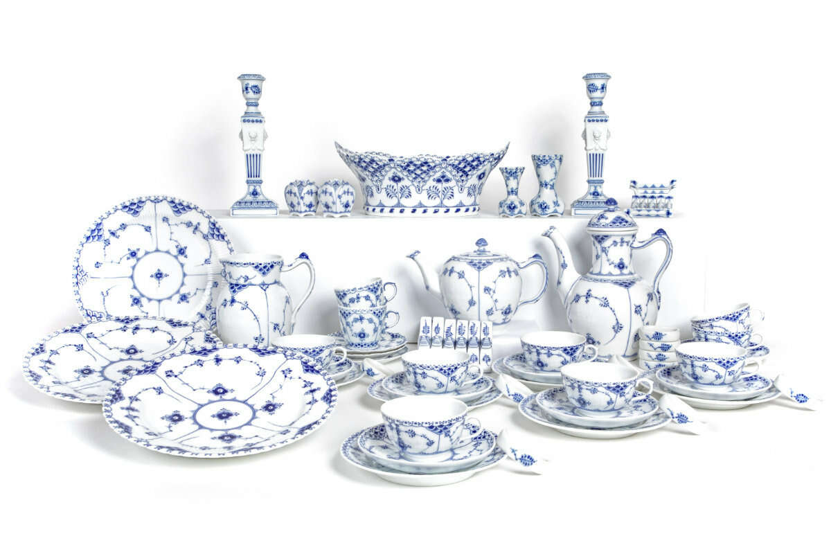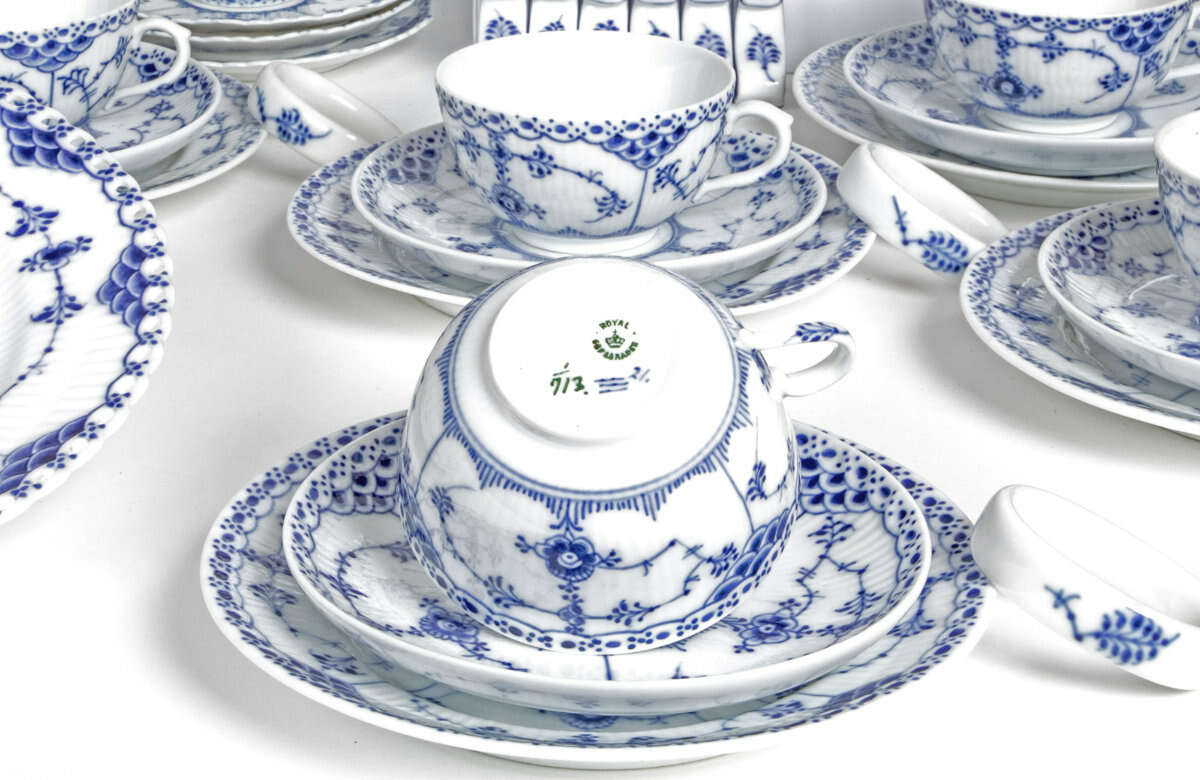 69 pcs., Royal Copenhagen, 2nd half 20th century, porcelain, monochrome blue decoration, including three core pieces (coffee pot, teapot, large milk jug), six teacups (Ø 8 cm) with saucers, large bread basket, three dinner plates (Ø 25 cm), pair of candlesticks, ten napkin rings, twelve knife rests, eight spoon rests (six identical, two with floral motif), various individual pieces including four table vases, four cups (two Ø 7 cm, two Ø 8 cm), six breakfast plates (Ø 16.5 cm) and four small saucers (three ''Full Lace'', one ''Half Lace''), all pieces with underglaze-blue factory mark