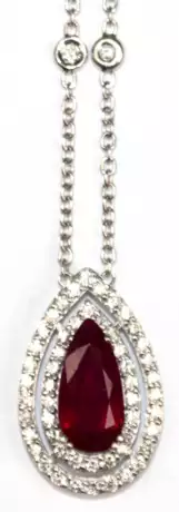 Rubin-Brillant-Collier, 750er WG, ausgefasst mit 1 Rubin im facettierten Tropfenschliff von ca. 2,16 ct. und 56 Brillanten, davon 4 in der Ketten von zus. ca. 0,78 ct., VVS-Si, Karabinerverschluß, Ges.-Gew. 6,91 g,variab…