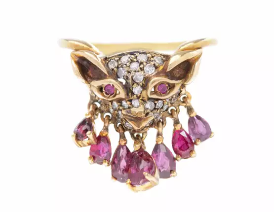 750 Gelbgold. Reizendes Katzenköpfchen ausgefasst mit Achtkant-Diamanten mit kleinen Rubinaugen über beweglichen Rubintropfen, ca. 1.20 ct. Gr. 48, 5 g.