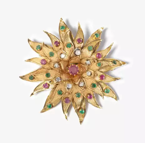 750 Gelbgold. Nachahmung einer stilisierten Chrysantheme mit einem zentralen Rubin von ca. 0.50 ct, begleitet von zahlreichen kleinen Smaragden, Brillanten und Rubinen. L 5x5 cm, 27 g.