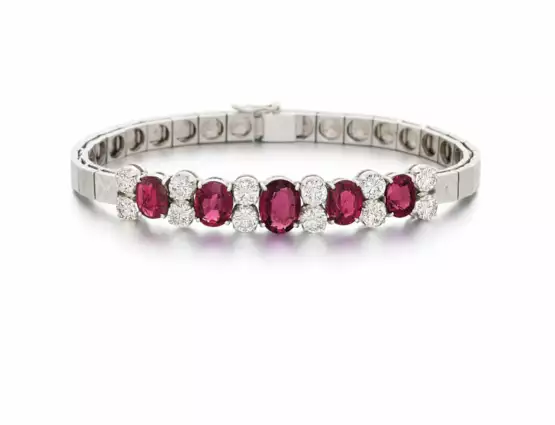 Gemstones: 5 oval, faceted rubies, in total ca. 5,2 ct., violet tinge, transparent.