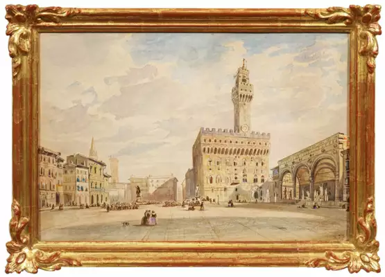 In effektvoller Licht- und Schattenführung inszenierte, durch rege Personenstaffage belebte, stimmungsvolle Vedute des berühmten Florentiner Platzes. Charakteristisches Blatt des Künstlers, der vornehmlich durch meisterhaft atmosphärische, lichterfüllte, städtische Ansichten in Aquarelltechnik Bekanntheit erlangte. Rudolf von Alt lernte bei seinem Vater, dem Landschaftsmaler Jakob Alt, und studierte 1825-1832 an der Wiener Akademie, ab 1826 in der Landschaftsklasse Josef Mössmers. Rasch hoch prämiert, stellte er ab 1830 an derselben aus. 1848 wurde Rudolf von Alt Mitglied der Akademie und 1879 Professor. Im selben Jahr gehörte er zu den Gründungsmitgliedern der Wiener Secession und zählt bis heute zu den international populärsten Wiener Künstlern des 19. Jhs.; Die große künstlerische Leistung des Freilichtmalers liegt in seiner virtuosen Beherrschung des Aquarells. In einer Vielzahl topographisch genauer, stimmungsvoller Ansichten schilderte er europäische Metropolen - mit Vorliebe seine Heimatstadt Wien - zu den unterschiedlichen Jahres- und Tageszeiten. Aquarell/Papier. R. u. sign.; Ca. 25 cm x 36,5 cm. Rahmen.