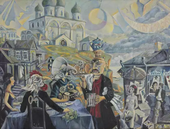20th C. Russian School Surrealist Painting. Oil on canvas. Signed lower right. Sight size: 18 x 24 in. Overall framed size: 23 x 29 in.