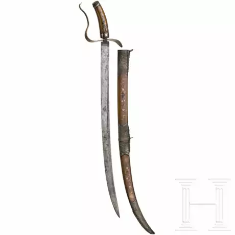 Leicht gekrümmte Rückenklinge mit beidseitig doppelter schmaler Kehlung. Am Ansatz der Kehlung jeweils fein gravierter floraler Dekor. Faustbügel und Hilze aus Kupfer mit fein in Silber und Niello eingelegtem Dekor. Locker, die Knaufkappe fehlt. Scheide aus Kupferblech mit beidseitig in Silber, Buntmetall und Niello eingelegten Blütenranken. Fein getriebene und gravierte Beschläge aus Silberblech mit zwei anhängenden Trageringen. Länge 84 cm.