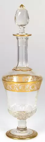 Лот 578 | Saint Louis-Karaffe "Thistle Gold", Frankreich, Mitte 20. Jh., Klarglas, handgeschliffen, reiche Goldstaffage, Schliffdekor und umlaufender Ätzdekor, geschliffener, zapfenförmiger Stopfen, Ges.-H. 37 cm