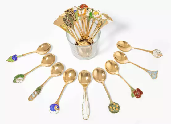Silber, vergoldet/Email. Herstellermarke Robbe & Berking. Jahreslöffel von 1984–2007 mit emaillierten Tier- und Pflanzenmotiven. Mit Vitrine. Halbmond/Krone, Herstellermarke, Feingehalt 925. Zus. ca. 1590 g.