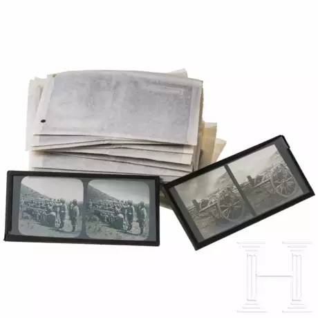 Insgesamt 20 Schwarzweißdias mit Darstellungen von Kämpfern unterschiedlicher Nationen, Artillerie, Infanterie, Feldsituationen, Lager etc. (Maße ca. 8 x 10 cm). Dazu zehn breite Sterodias dieser Art (Maße ca. 8,5 x 10 cm). Teilweise beschriftet. Vereinzelt kleine Risse, leicht beschädigt, Gebrauchs- und Altersspuren.