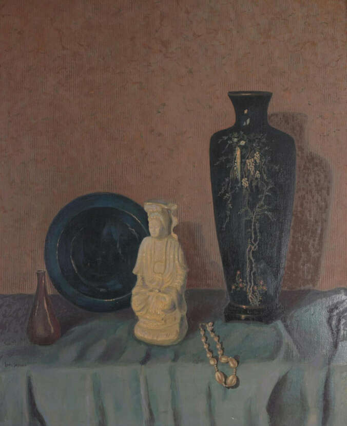 Still life painting. Oil on board. Signed lower left. Depicting Oriental objects on a table top. Sight Size: 24 x 20 in. Overall Framed Size: 30.5 x 26.5 in.