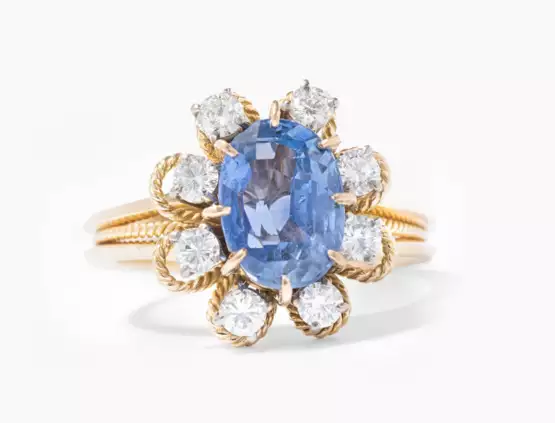 750 Gelbgold. Ovaler Saphir, wohl Ceylon, von ca. 2 ct, mit acht Brillanten von ca. 0.40 ct. in gekordeltem Blumensujet. Gr. 56, 5 g.