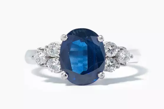 750 Weissgold. Ein ovaler Saphir von ca. 2.40 ct flankiert von je drei Brillanten von zus. ca. 0.30 ct. Gr. 54, 4 g.